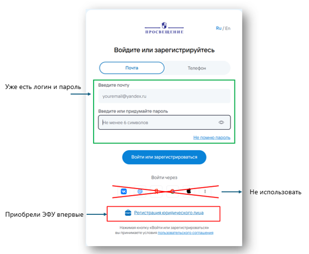 Внимание! К данной учётной записи будет привязана роль «Администратор школы» и комплекты с ЭФУ. Пожалуйста, не используйте для регистрации почту, принадлежащую отдельному сотруднику. Используйте общий электронный адрес образовательной организации.
