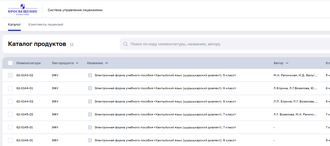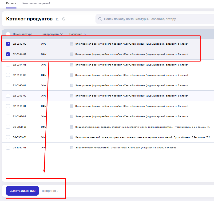 Здесь Вы выбираете из списка необходимый состав комплекта, поставьте галочку в квадрате сбоку, чтобы выбрать их. Для удобства поиска можно использовать «Фильтр» вводя код номенклатуры нужного учебника. После выбора учебников необходимо нажать на кнопку «Выдать лицензии».