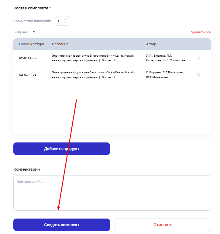 Шаг 4. После заведения всех полей и проверки состава комплекта нажмите кнопку «Создать комплект».