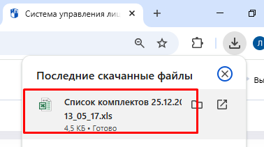 При нажатии «Экспорт списка комплектов» будет сформирован файл Excel в правом верхнем углу вашего браузера.