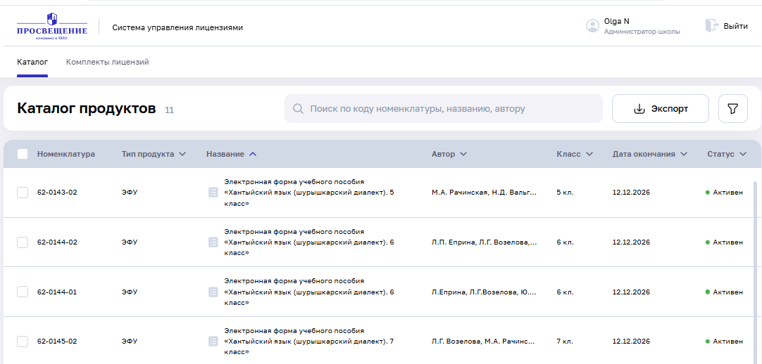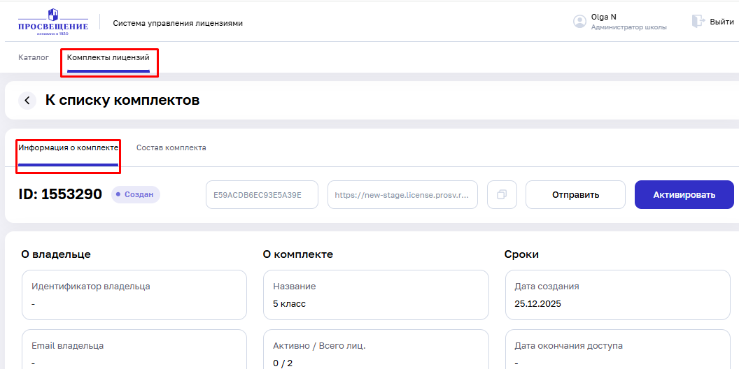 Образовательная организация с ролью «Администратор Школы» может создавать комплекты для учащихся и учителей, а также деактивировать их в случае надобности.
