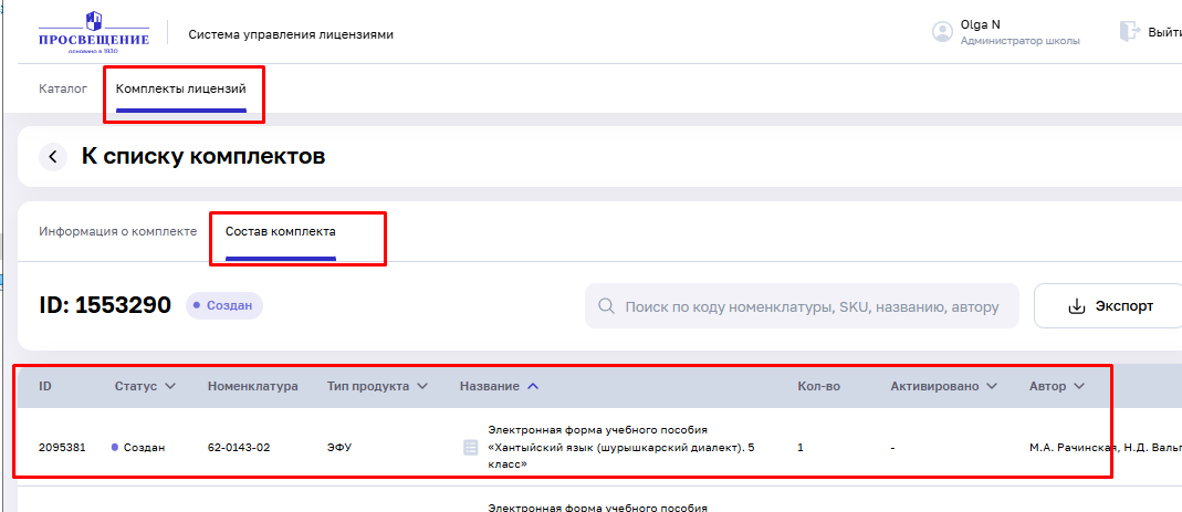 - Найдите комплект ученика в созданных комплектах;