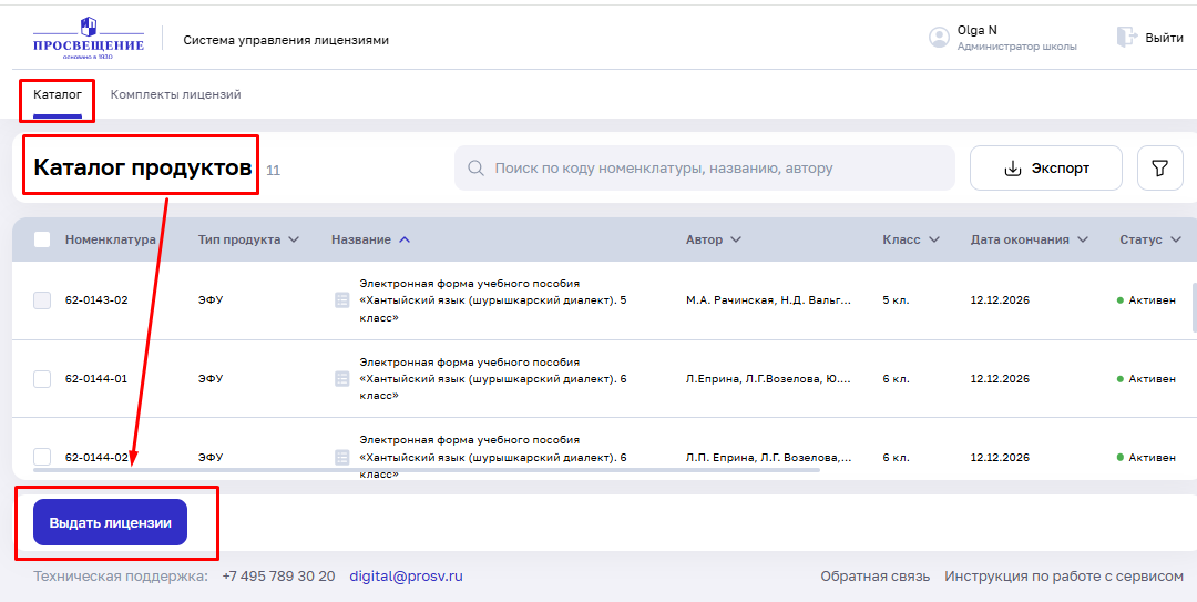 Шаг 1. Создание комплектов происходит в разделе «Каталог». Перейдите в раздел, а затем нажмите на кнопку «Выдать лицензии».
