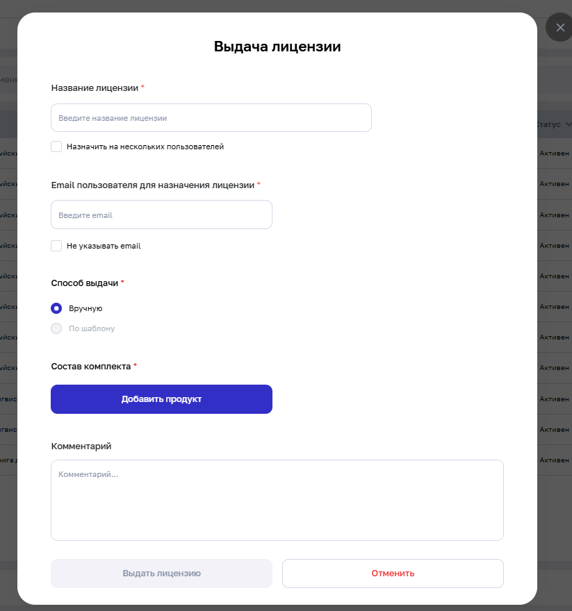 Для удобной доставки лицензии можно ввести email пользователя.