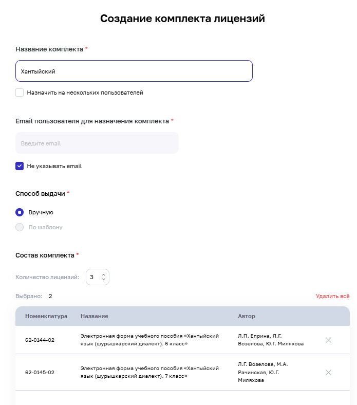 Для этого необходимо в форме «Создание комплекта лицензий» заполнить: